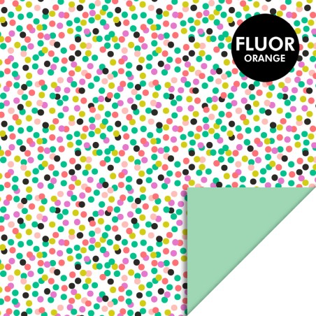 Small dots of confetti in green, black, pink, yellow and fluorescent orange on a 3 meter roll. This roll offers endless possibilities for wrapping presents. The light green back adds a fresh touch