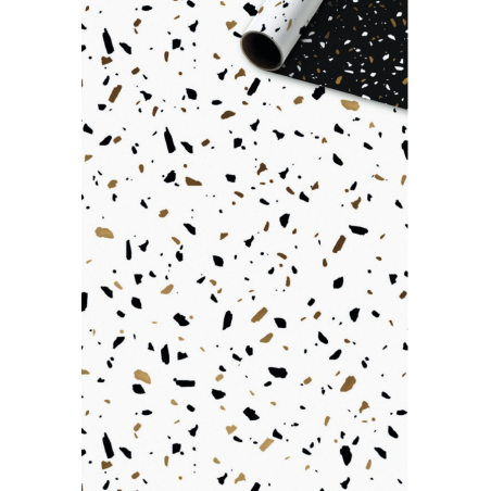 Sturdy double-sided gift wrapping paper in black/white with black, white and gold flakes. These Stewo wrapping paper rolls are printed on FSC wrapping paper. These rolls are 1.5 meters long and 70 cm wide.