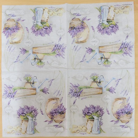 In the beautiful "Fleur De Provence" collection you will find these printed paper lunch napkins from the brand Ambiente. The image shows a charming collection of lavender bouquets in various rustic vases and jugs, with delicate details such as a watering can and a wooden sign with the text "Fleur". The soft colors and the detailed illustrations of the lavender flowers bring a touch of French country charm to your table.