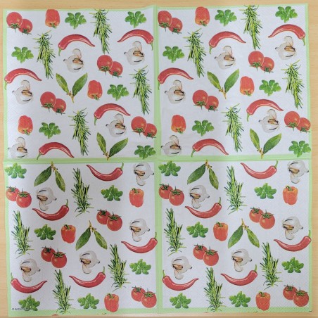 Welcome a piece of Italy into your home with these beautiful paper lunch napkins from the Ambiente brand. The napkins feature a colorful collection of Italian herbs and vegetables such as red peppers, garlic, paprika, tomatoes, bay leaves, rosemary, and basil. These vibrant and detailed illustrations bring a Mediterranean atmosphere to your table and make every meal particularly atmospheric and inviting.